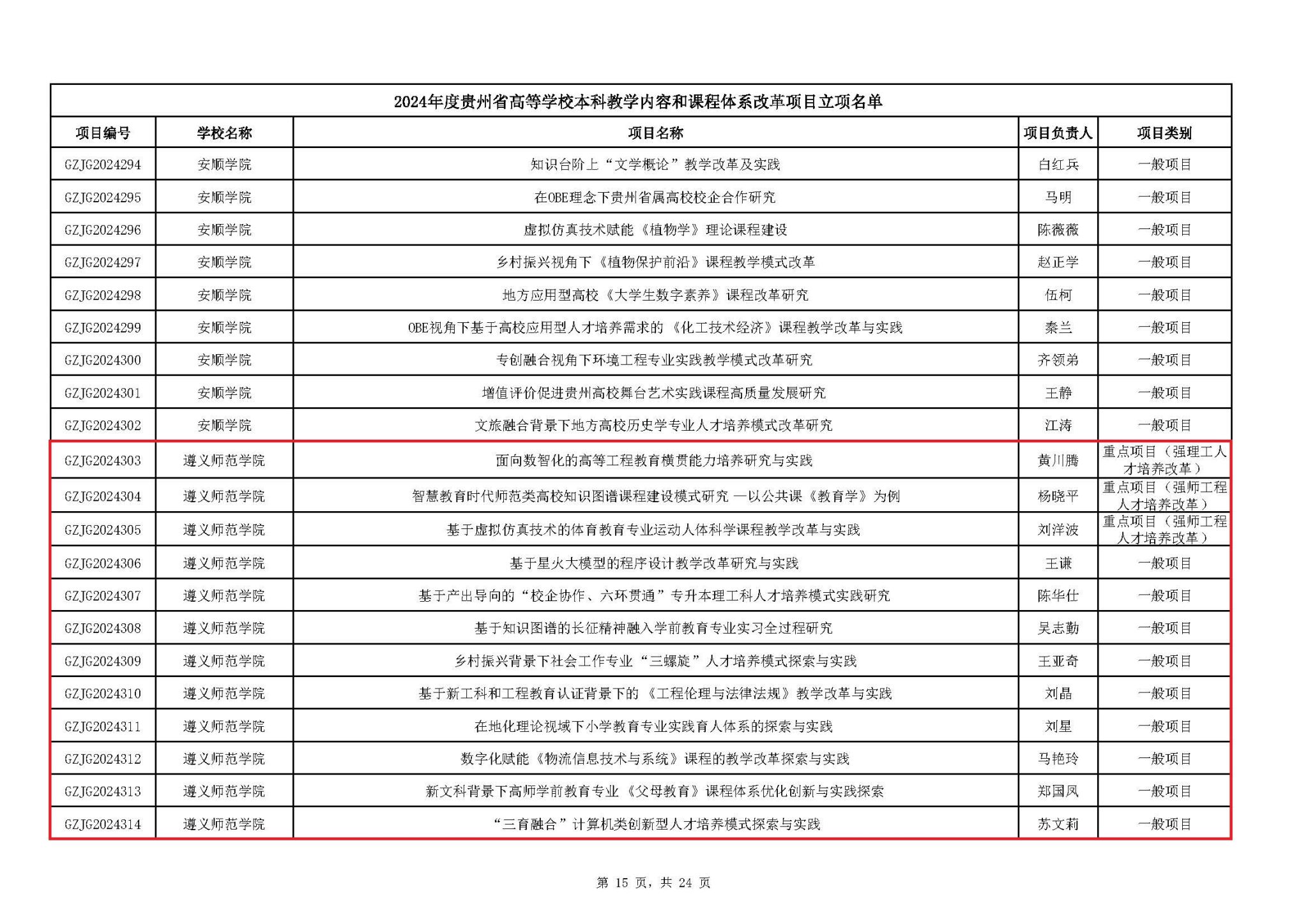近日,省教育厅公布了2024年度省级本科教学内容和课程体系改革项目立项名单。我校有18个项目获得立项,其中有3个重点项目,分别是强理工人才培养改革重点项目“面向数智化的高等工程教育横贯能力培养研究与实践”(负责人:黄川腾)、强师工程人才培养改革重点项目“智慧教育时代师范类高校知识图谱课程建设模式研究——以公共课《教育学》为例”(负责人:杨晓平)、强师工程人才培养改革重点项目“基于虚拟仿真技术的体育教育专业运动人体科学课程教学改革与实践”(负责人:刘洋波)。