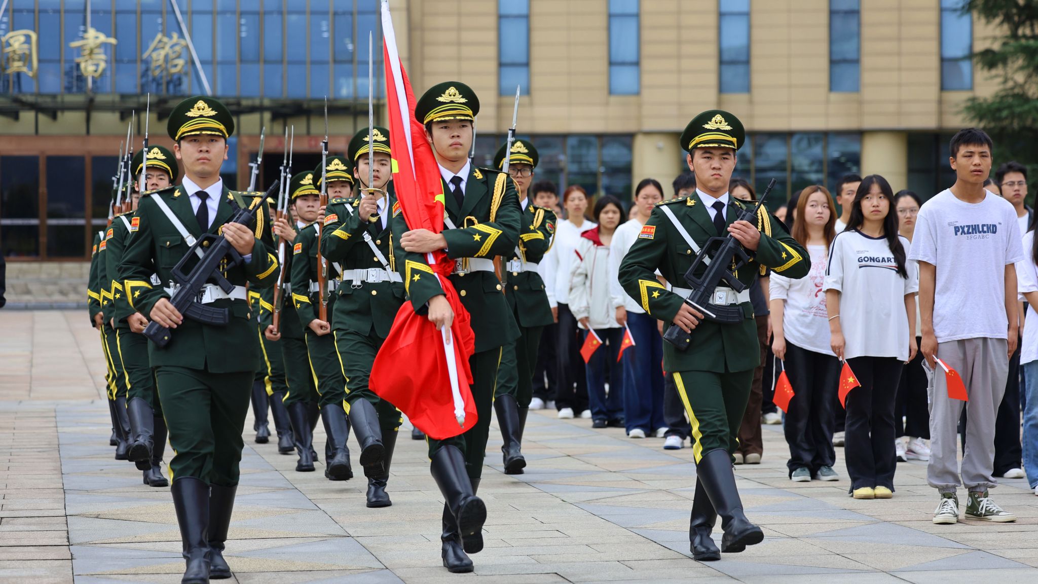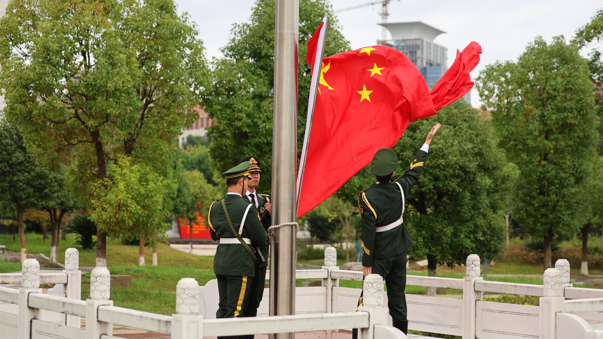 朝阳初升,映照校园。星空广场国旗台前,陈治松与师生代表整齐列队,神情庄重。英姿飒爽的国旗护卫队护送着五星红旗,迈着铿锵的步伐走向升旗台。在雄壮的国歌声中,全体师生凝视着鲜艳的五星红旗冉冉升起,高唱国歌。